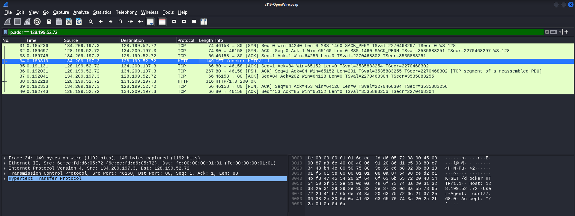 Esta comunicación muestra una interacción entre un cliente (134.209.197.3) y un servidor (128.199.52.72), donde el cliente está realizando una solicitud HTTP GET al servidor para obtener el recurso «/docker». Aquí está el análisis de cada línea, con énfasis en la línea 34: