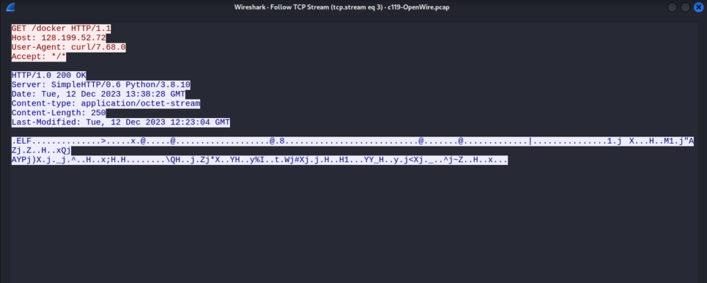 La solicitud (GET) indica que se está solicitando el recurso «/docker» desde el servidor con la dirección IP 128.199.52.72. El cliente que realiza la solicitud se identifica como «curl/7.68.0». El servidor responde con un código de estado «200 OK», lo que significa que la solicitud se completó con éxito. El servidor está utilizando SimpleHTTP/0.6 en Python/3.8.10 para manejar la solicitud. El contenido de la respuesta está en formato «application/octet-stream» y tiene una longitud de 250 bytes. La última modificación del recurso fue el «Tue, 12 Dec 2023 12:23:04 GMT».