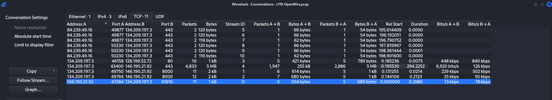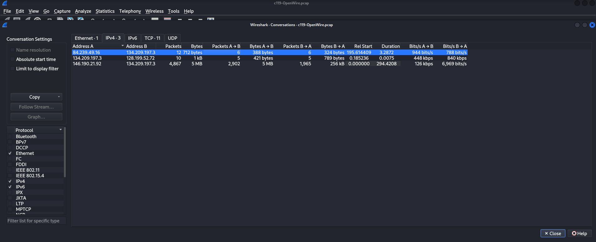 Si volvemos a la sección Statistics > Conversations, podemos identificar otras dos direcciones IP: 84.239.49.16 y 128.199.52.72.