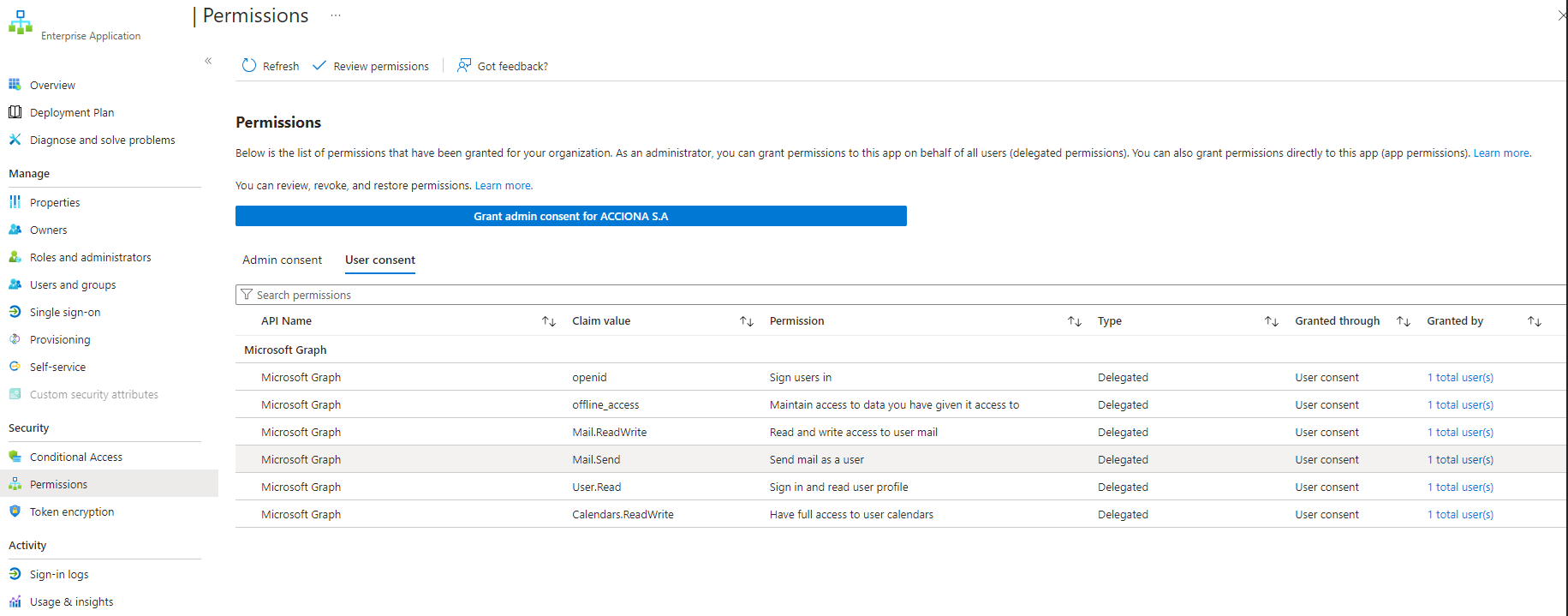 Eliminar las User Consent ya sea para un usuario específico, varios usuarios, no puede hacerse a través del portal. Actualmente, no existen características de interfaz de usuario para eliminarlas User Consent; únicamente se puede hacer con PowerShell o Graph API .
