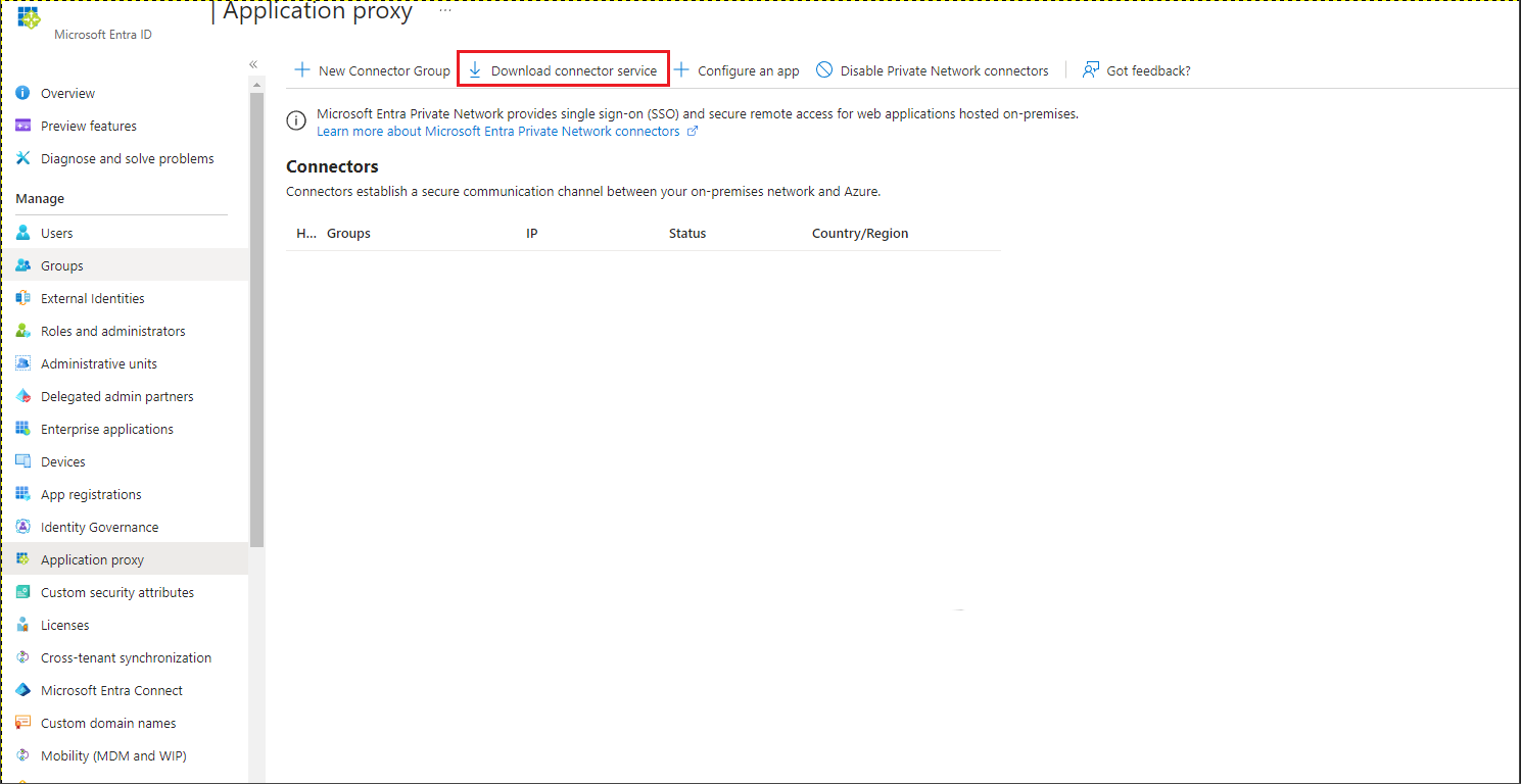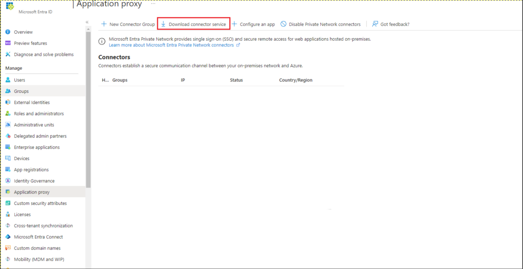 - Accede a Application Proxy: En el menú de Entra ID, busca y selecciona «Application Proxy» en la sección «Manage».