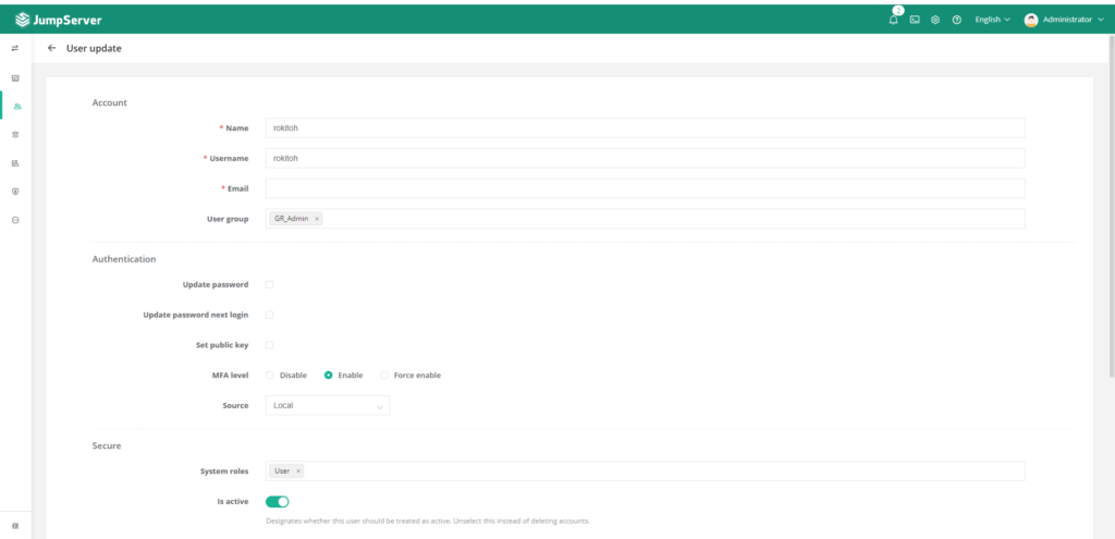 - Autenticación Segura: JumpServer ofrece autenticación de dos factores (2FA) para garantizar la seguridad de las conexiones. Además, puede integrarse con LDAP para una gestión centralizada de usuarios.