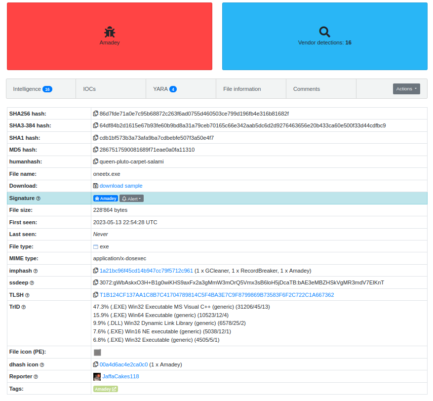 Al buscar en bazaar.abuse.ch, identificamos oneetx.exe como un archivo malicioso potencial.