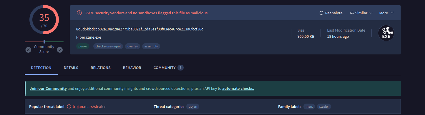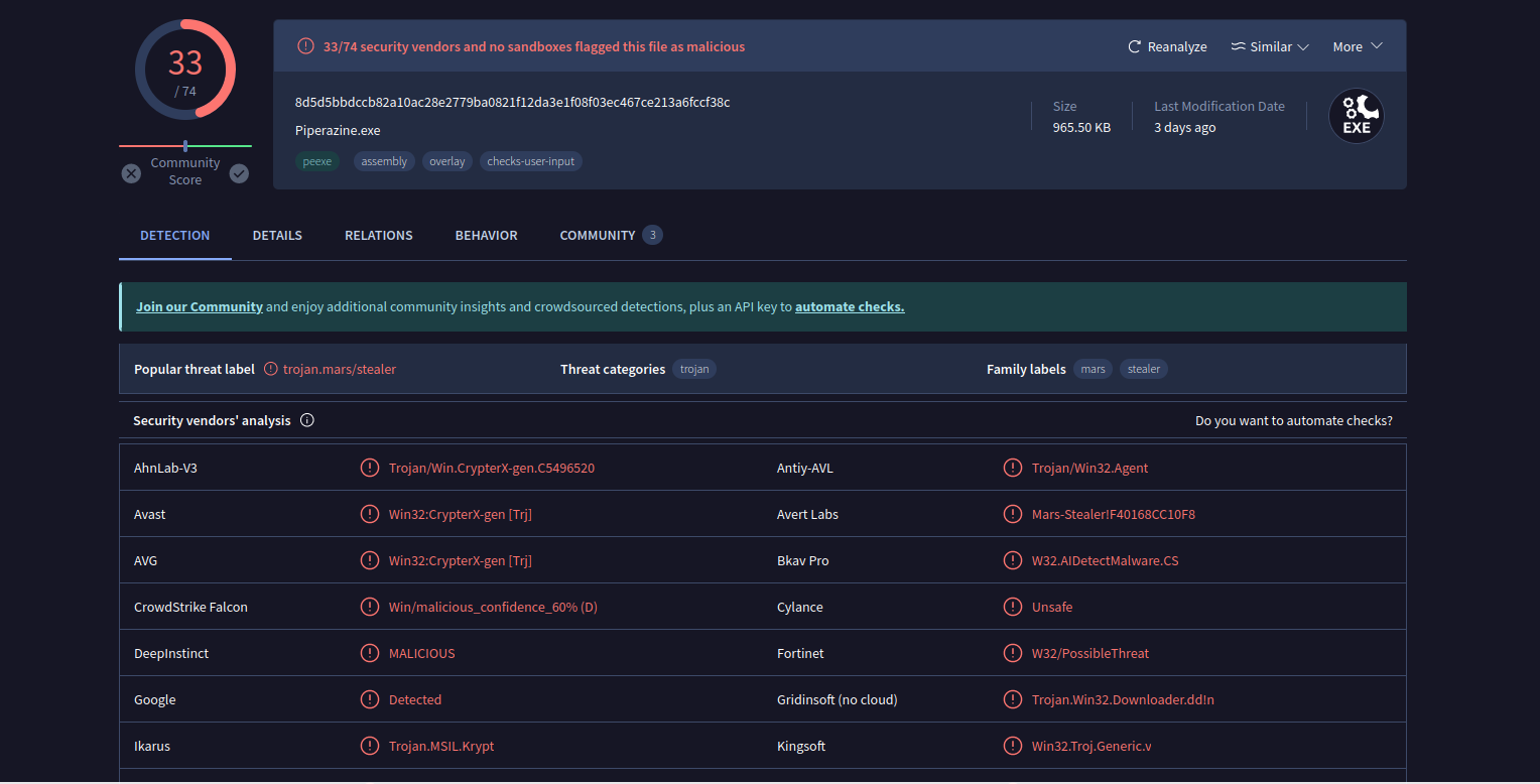 En la pregunta #1, pudimos comprobar que se trataba de un malware Trojan.Mars/Stealer.
