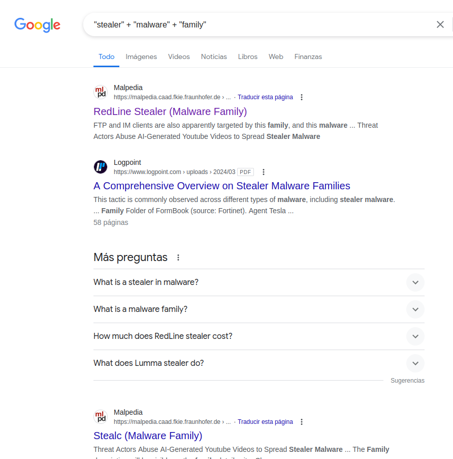 Buscando en internet por «stealer» + «malware» + «family», pude encontrar información sobre el nombre de la familia.