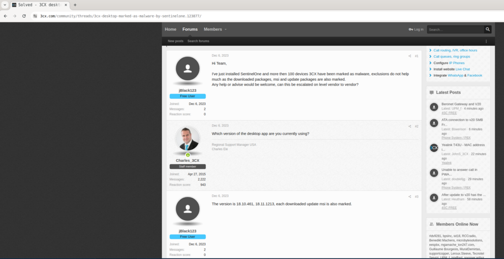 Realizamos una búsqueda avanzada en Google utilizando el siguiente término: site:https://www.3cx.com/community "3CX" + "malware", lo que nos llevó a una entrada en el foro oficial de 3CX (Solved – 3CX desktop marked as Malware by SentinelOne) . En dicha entrada, se menciona específicamente lo siguiente: