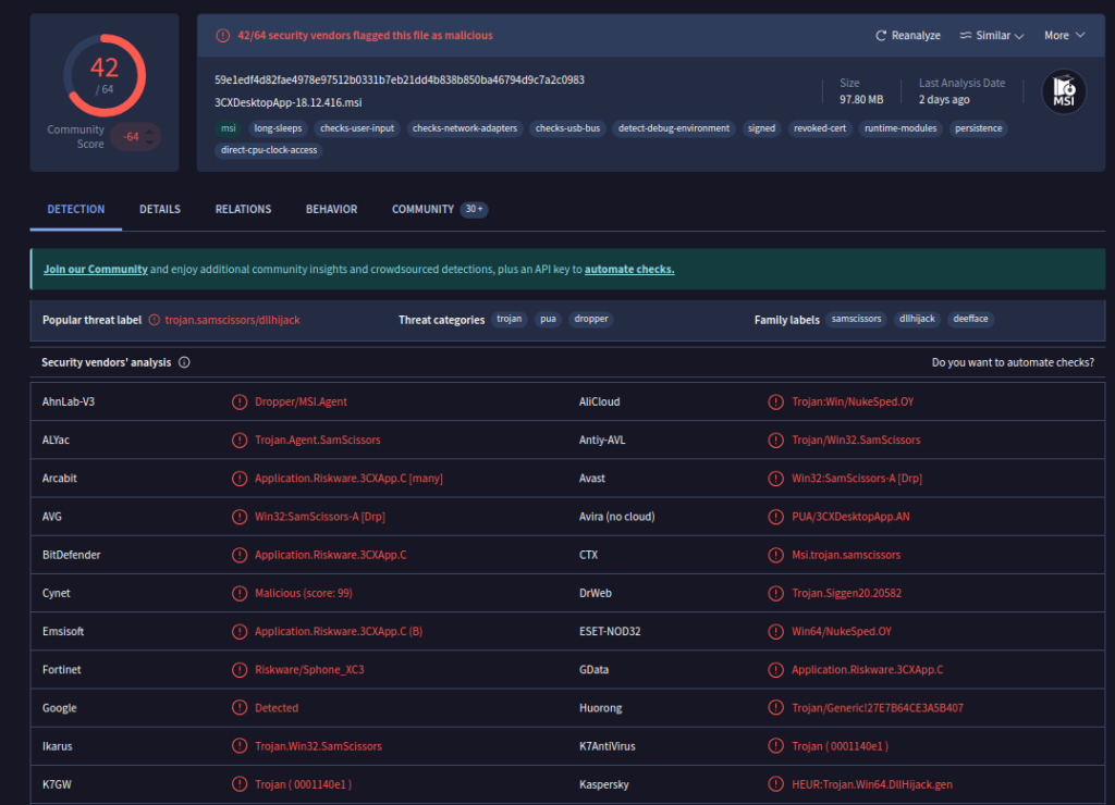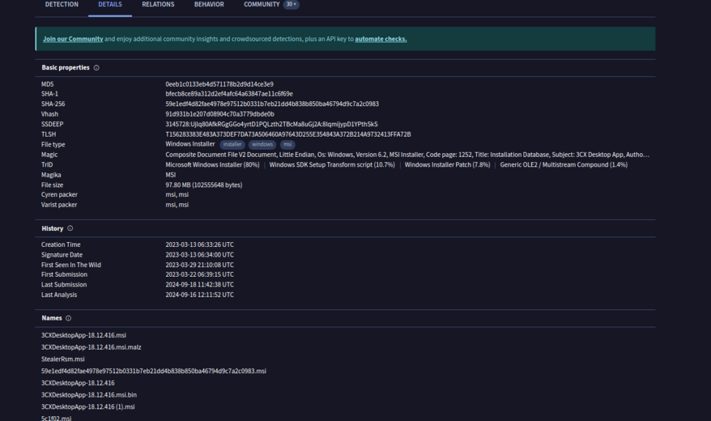 0eeb1c0133eb4d571178b2d9d14ce3e9 3CXDesktopApp-18.12.416.msiCon este hash MD5, buscamos en la base de datos de VirusTotal para rastrear el historial del archivo. A partir de la información obtenida, verificamos que el archivo malicioso fue creado el 13 de marzo de 2023 a las 06:33:26 UTC.