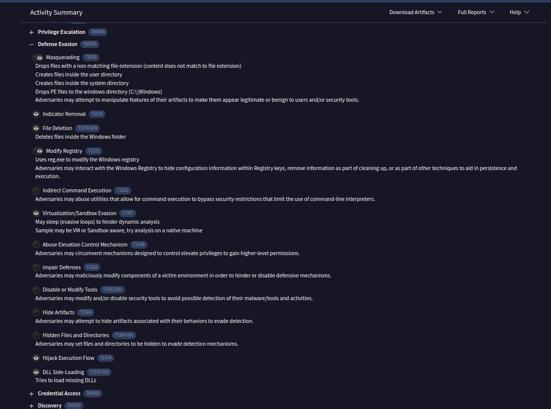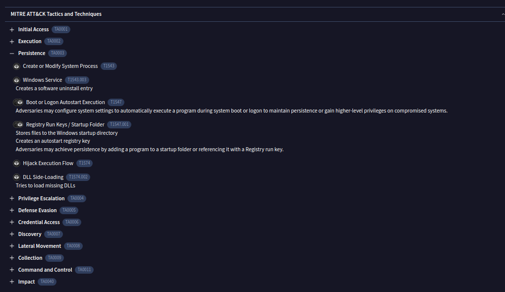En la sección «MITRE ATT&CK Tactics and Techniques», identificamos las técnicas empleadas por el malware, donde se mostró el uso de la sub-técnica T1574.002.