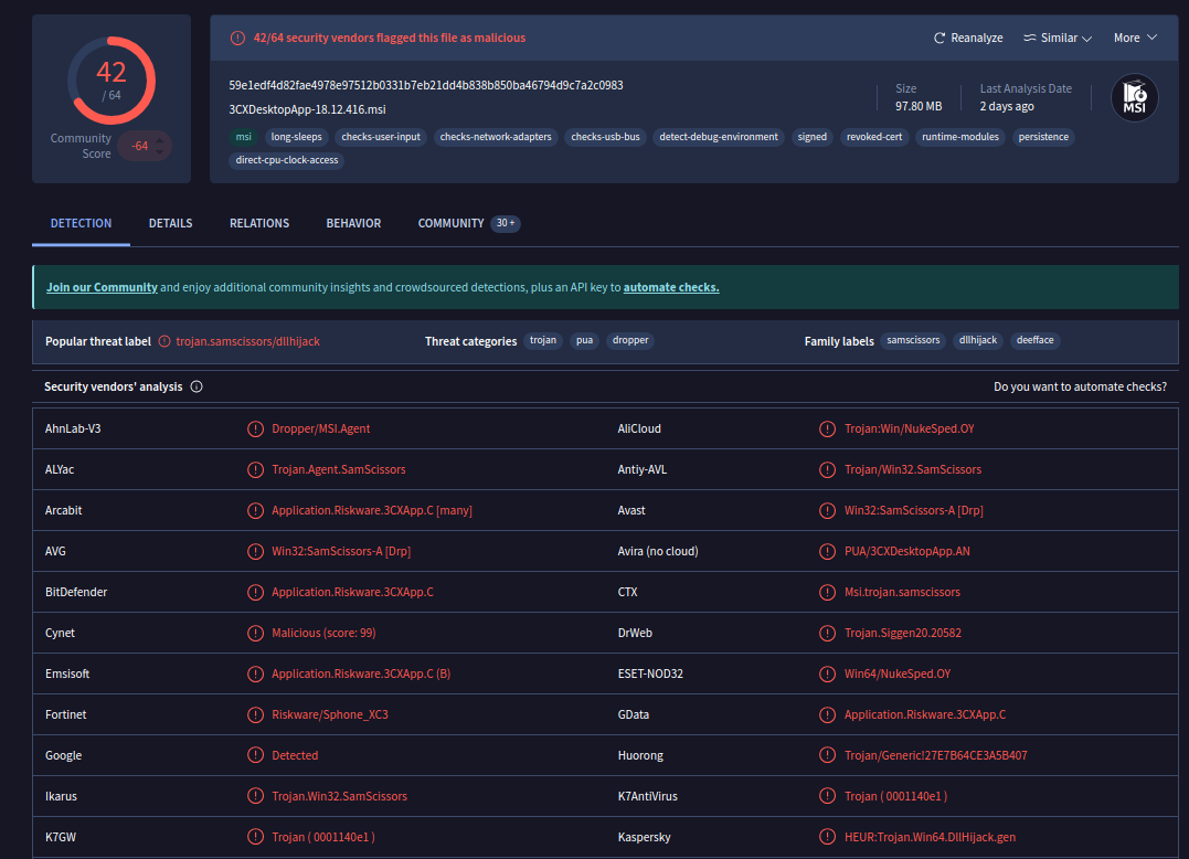 "The version is 18.10.461, 18.11.1213, each downloaded update msi is also marked."A partir de esta información, concluimos que dos versiones de 3CX han sido identificadas como maliciosas: 18.10.461 y 18.11.1213.