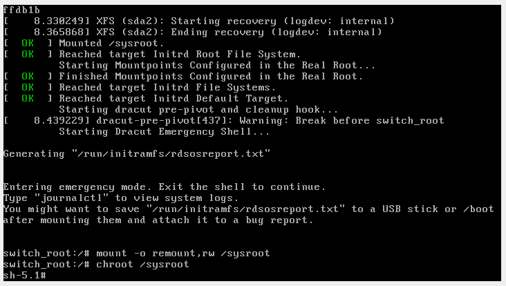 El sistema arrancará en un entorno de shell de emergencia, donde verás un