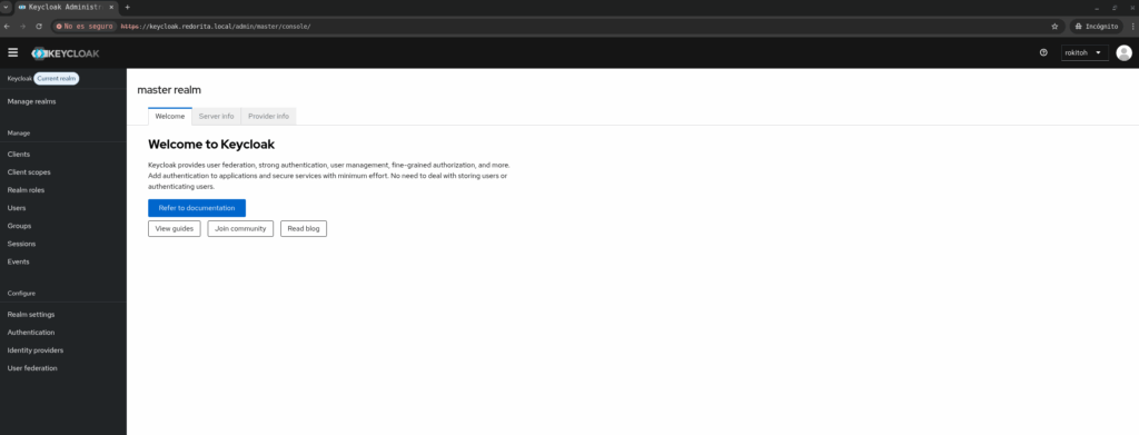 Accedemos desde el navegador a la URL configurada en Nginx (en este caso: https://keycloak.redorbita.local) y nos autenticamos utilizando las credenciales que generamos previamente.